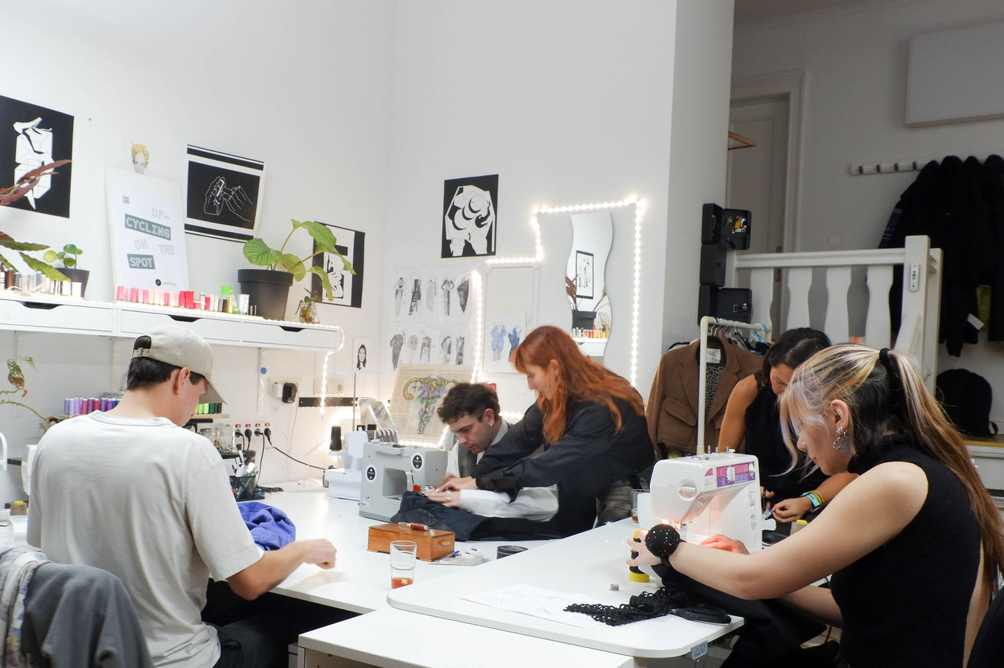 The studio is fully equipped with all cutting and sewing tools, a sewing machine for each person (4 total), plus an overlock.